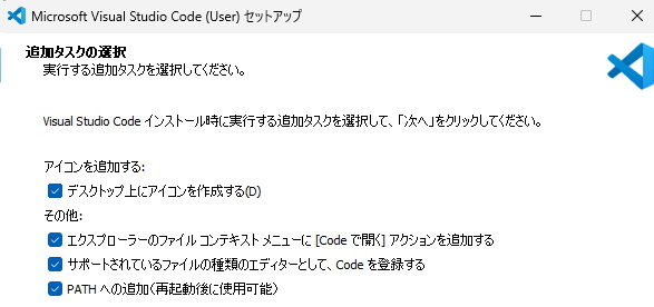 (例:VSCodeUserSetup-x64-xxxx.exe)をダブルクリックしてインストールを開始します。